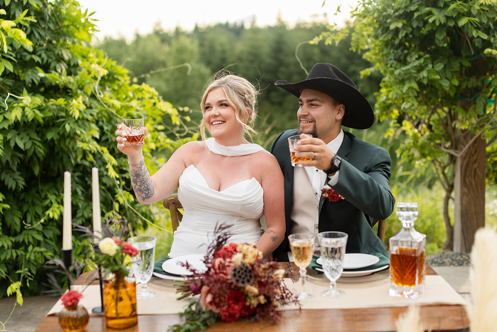 Charles complemented her perfectly in a striking hunter green suit, also provided by Weddings With Joy. We finished his look with a black cowboy hat that grounded the look in western influence while still feeling refined.