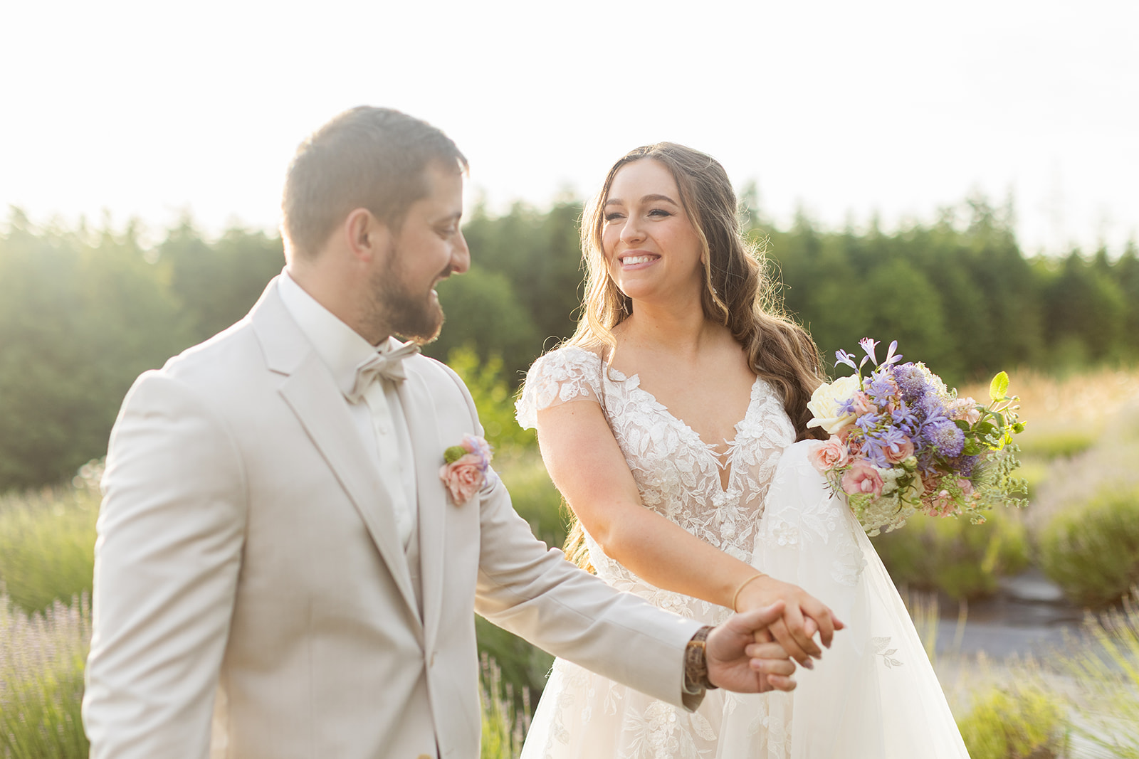 The photography team—Hazel and Fern Photography, Emma Wargo Photo and Marie Nelson Photography—captured this design beautifully. From portraits in front of the greenery-covered arbor to soft, romantic moments in the lavender fields, every image reflects what makes a whimsical spring wedding at Hillside Farms Tenino so special.